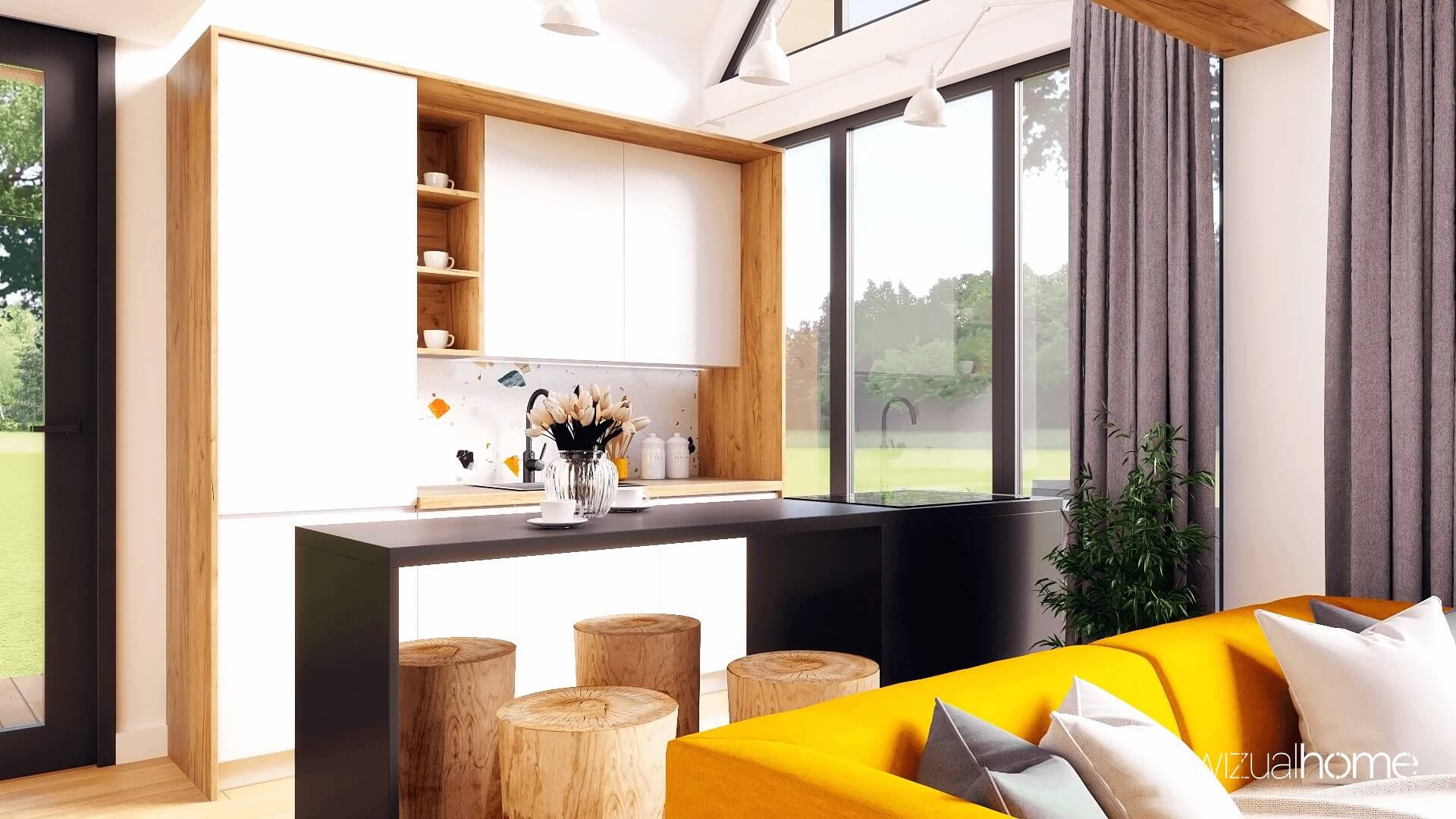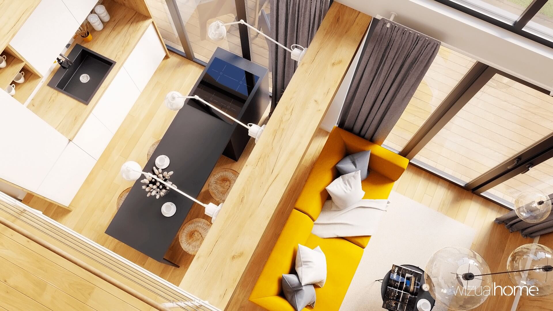 Do tego projektu wybrałam jasny kolor drewna, który kojarzy się również z naturą. Znajduje się on na podłodze, w lamelach w salonie, meblach kuchennych i belce sufitowej. Drewniane są również schody prowadzące na antresolę.