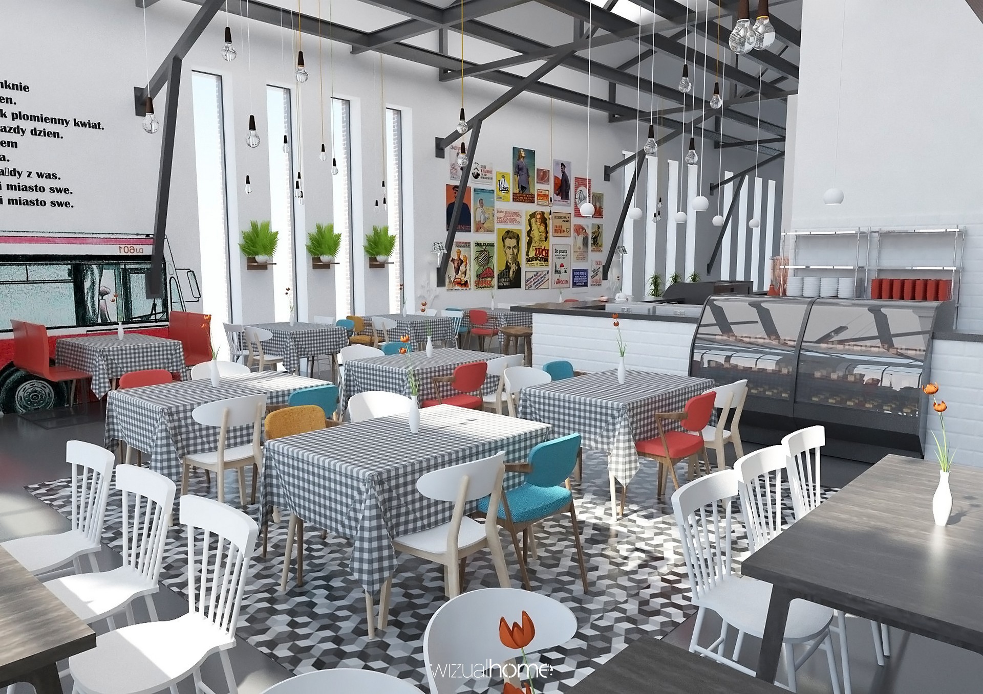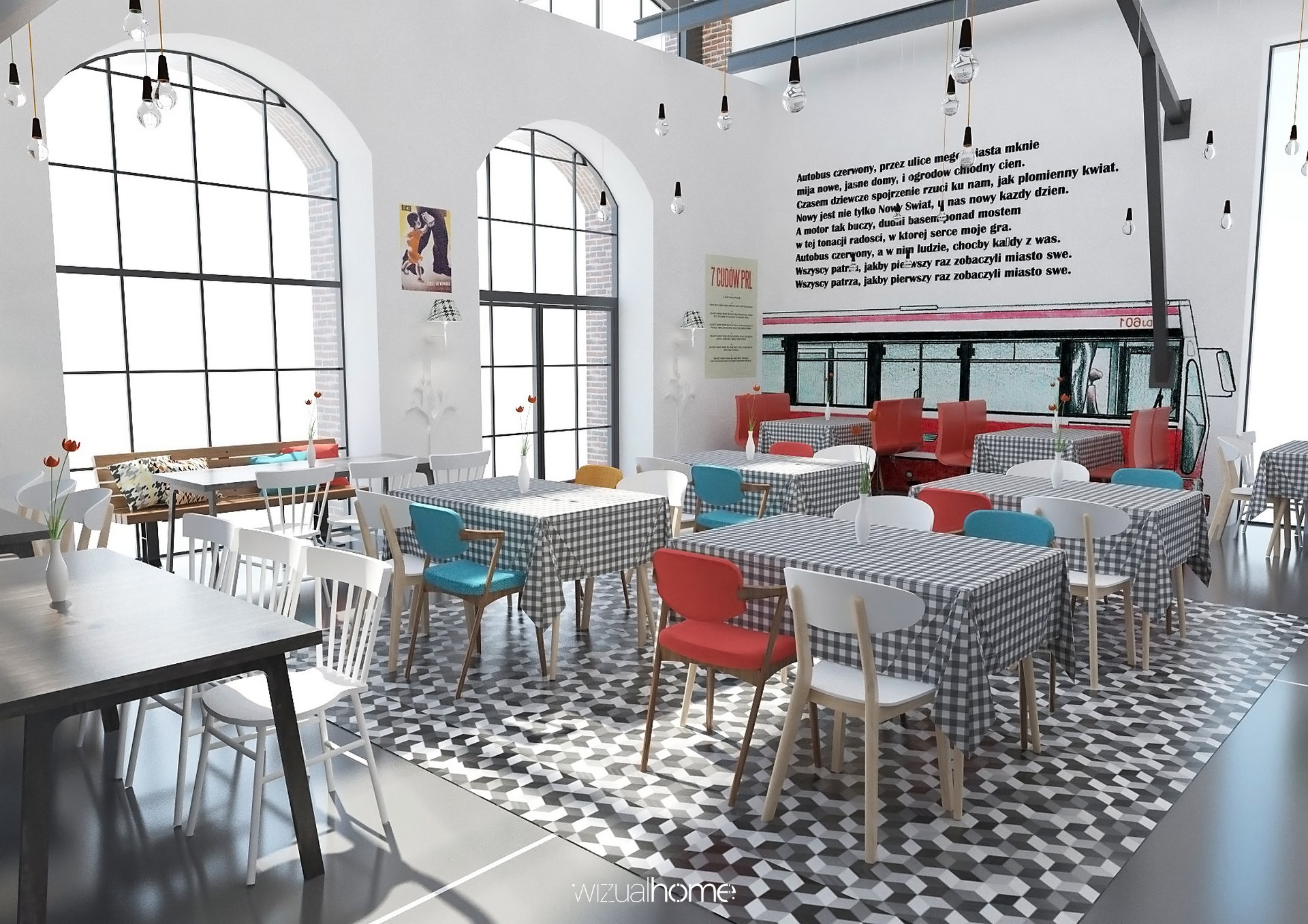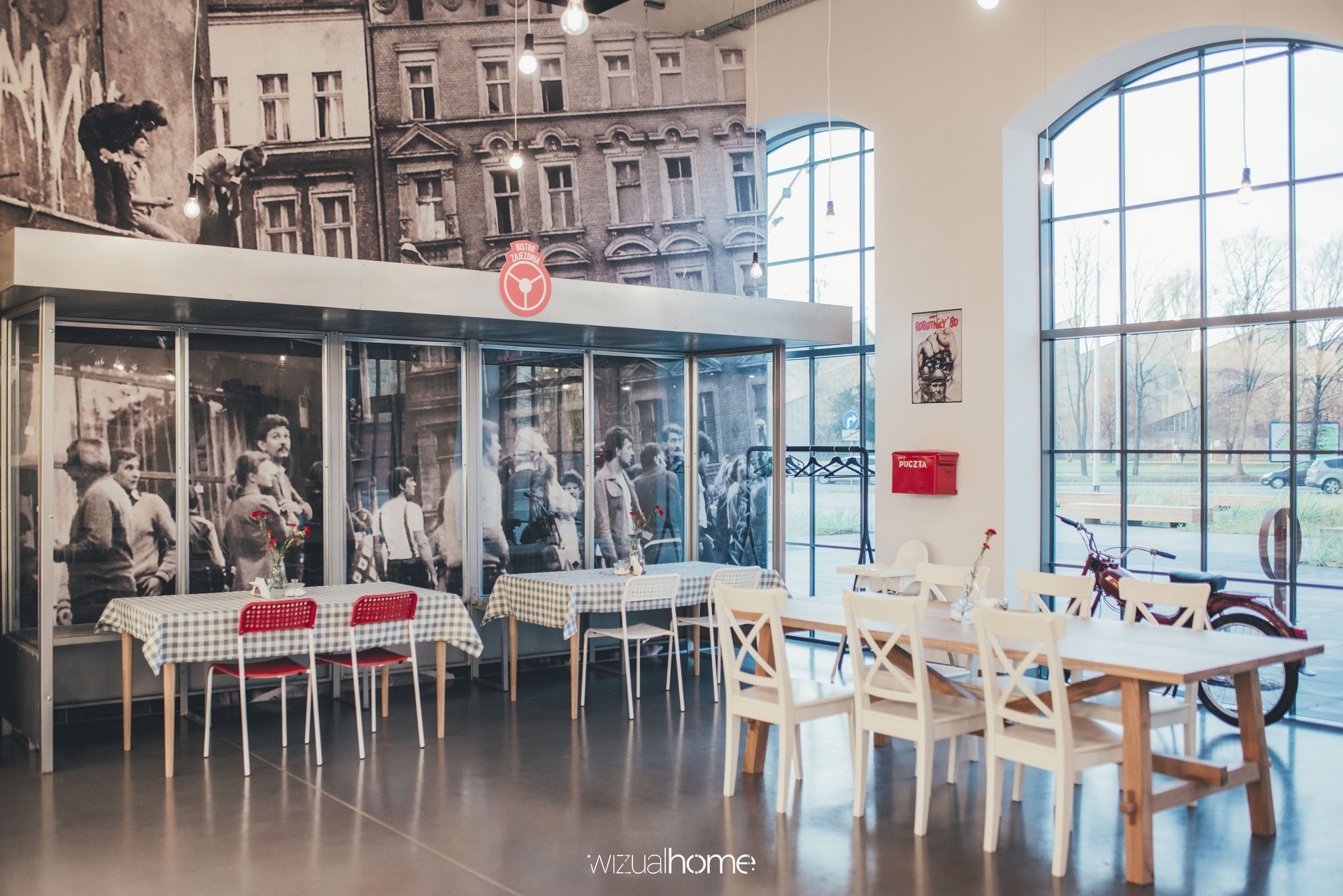 Kolejny mój projekt z serii „ratunku”. Projekt kawiarni Zajezdnia we Wrocławiu powstał zaledwie w kilka dni. Miało być w klimacie PRL, ale jednak przystępnie dla młodszego pokolenia. Białe prostokątne płytki na ladzie, plakaty z hasłami z lat 80′, szara krata na obrusach i kolorowe krzesła świetnie oddają ten klimat. Najciekawszym elementem jest umieszczenie stołu i krzeseł w przystanku autobusowym. I co Wy na to?