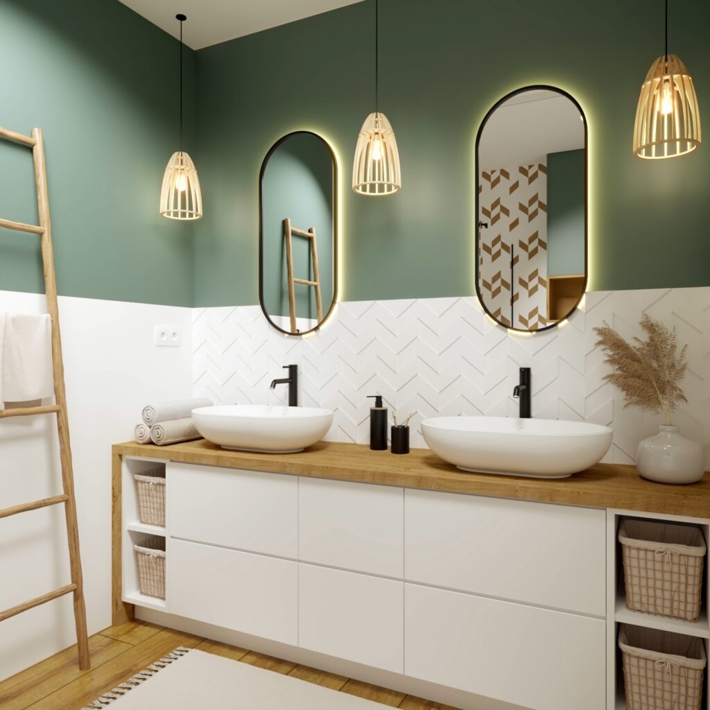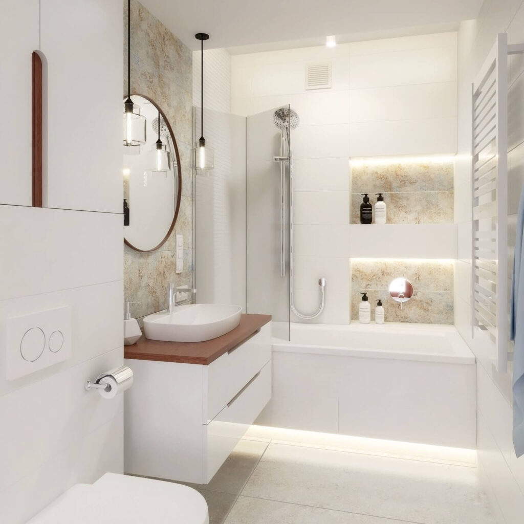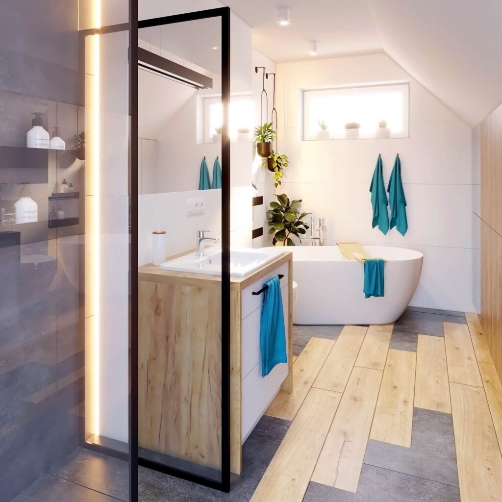 Na szczęście nawet przy takim nietypowym układzie udało się optycznie wyrównać proporcje łazienki i nie jest już długim jamnikiem.